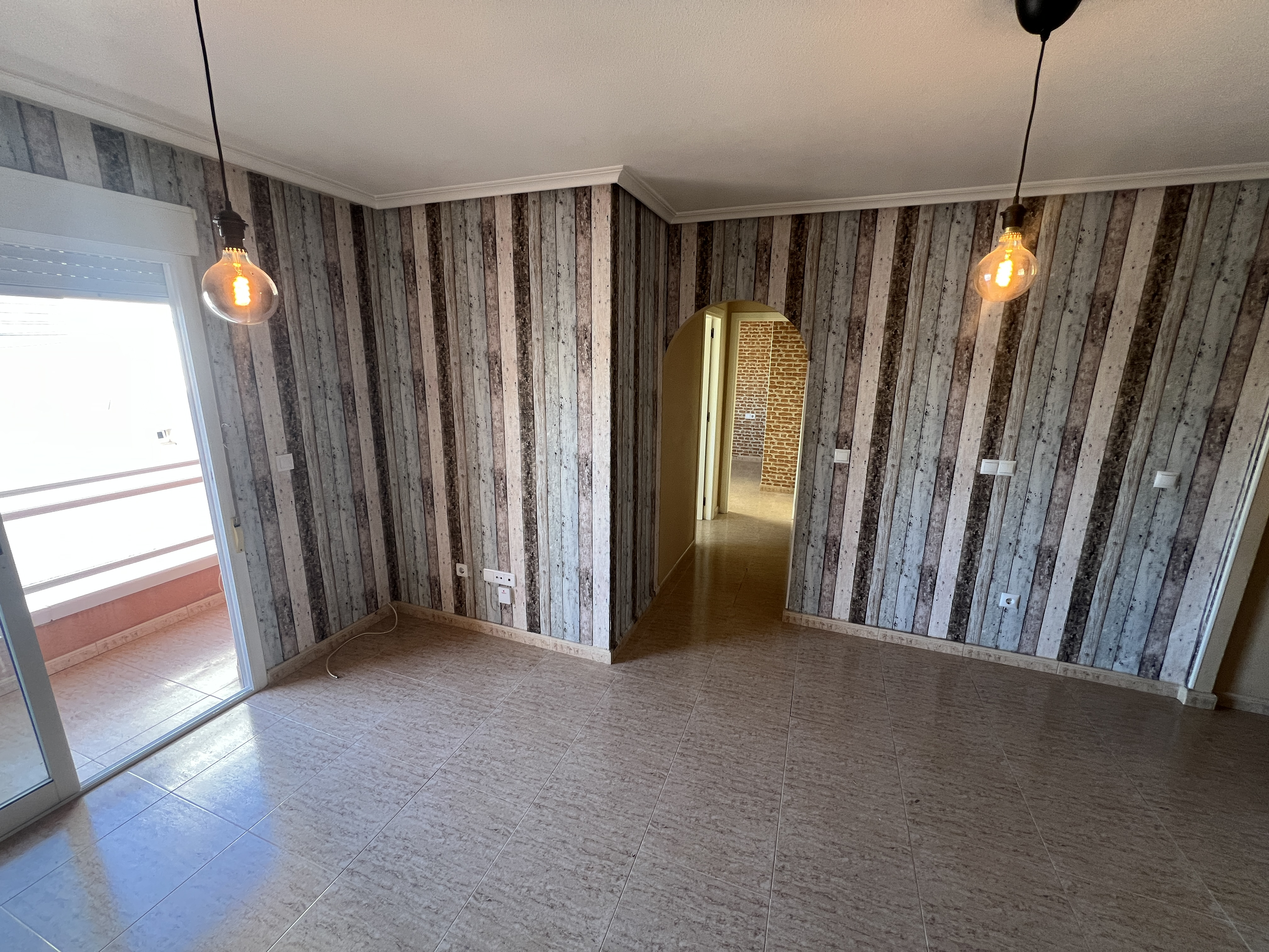 El salón-comedor es luminoso y espacioso, decorado con una pared moderna que le da un toque especial. La iluminación colgante añade un ambiente acogedor, perfecto para relajarse o recibir visitas. Además, el aire acondicionado garantiza confort durante todo el año.